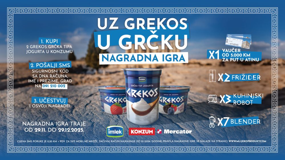 U periodu od 29. novembra do 29. decembra 2025. godine, svi koji u Konzum i Mercator prodavnicama na području FBIH, kupe barem dva Grekos grčka tipa jogurta i pošalju SMS poruku sa sigurnosnim kodom sa računa, uz svoje ime, prezime i grad, na broj 091 210 002, postaju učesnici ove nagradne igre.
